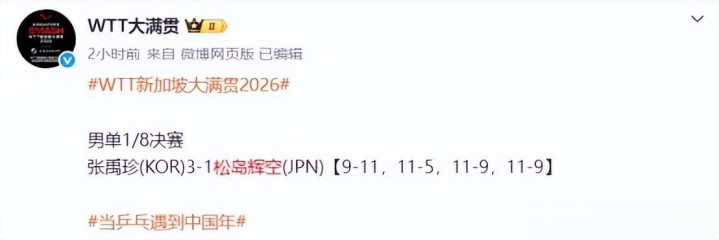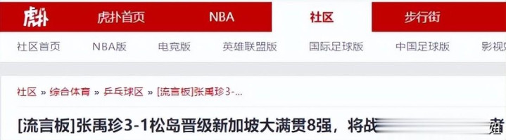虎扑网——张禹珍3-1松岛晋级新加坡大满贯8强,将战王楚钦与林德胜者