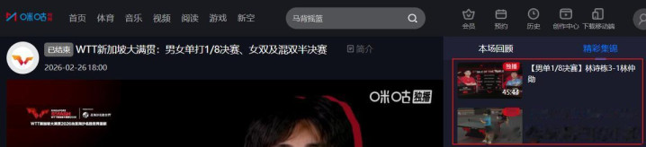 咪咕视频——WTT新加坡大满贯:男女单打1/8决赛、女双及混双半决赛